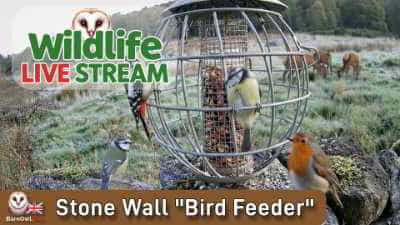 ❤️ Watch Birds feed & Red Deer grazing on this Live stream web camera. If you like watching live streaming wildlife cameras, this is a great live stream to watch. On this live streaming webcam, you will see wild birds enjoying this bird feeder on a dry stone wall in the Peak District National Park, England. See robins, blue tits, great tits, coal tits, wrens, dunnocks, woodpeckers and many more on this unique bird feeder. In the background, in the rough grasses on most days, spot wild red deer grazing if you keep watching.